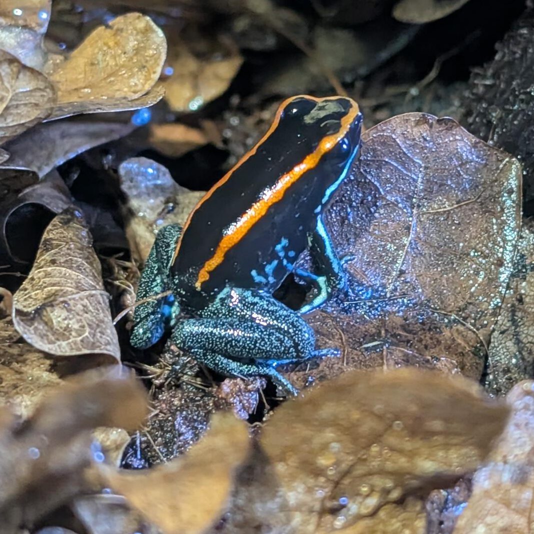 De Phyllobates Vittatus is een prachtige soort met een zwart lichaam, felgele of oranje strepen en een metallic groene glans.