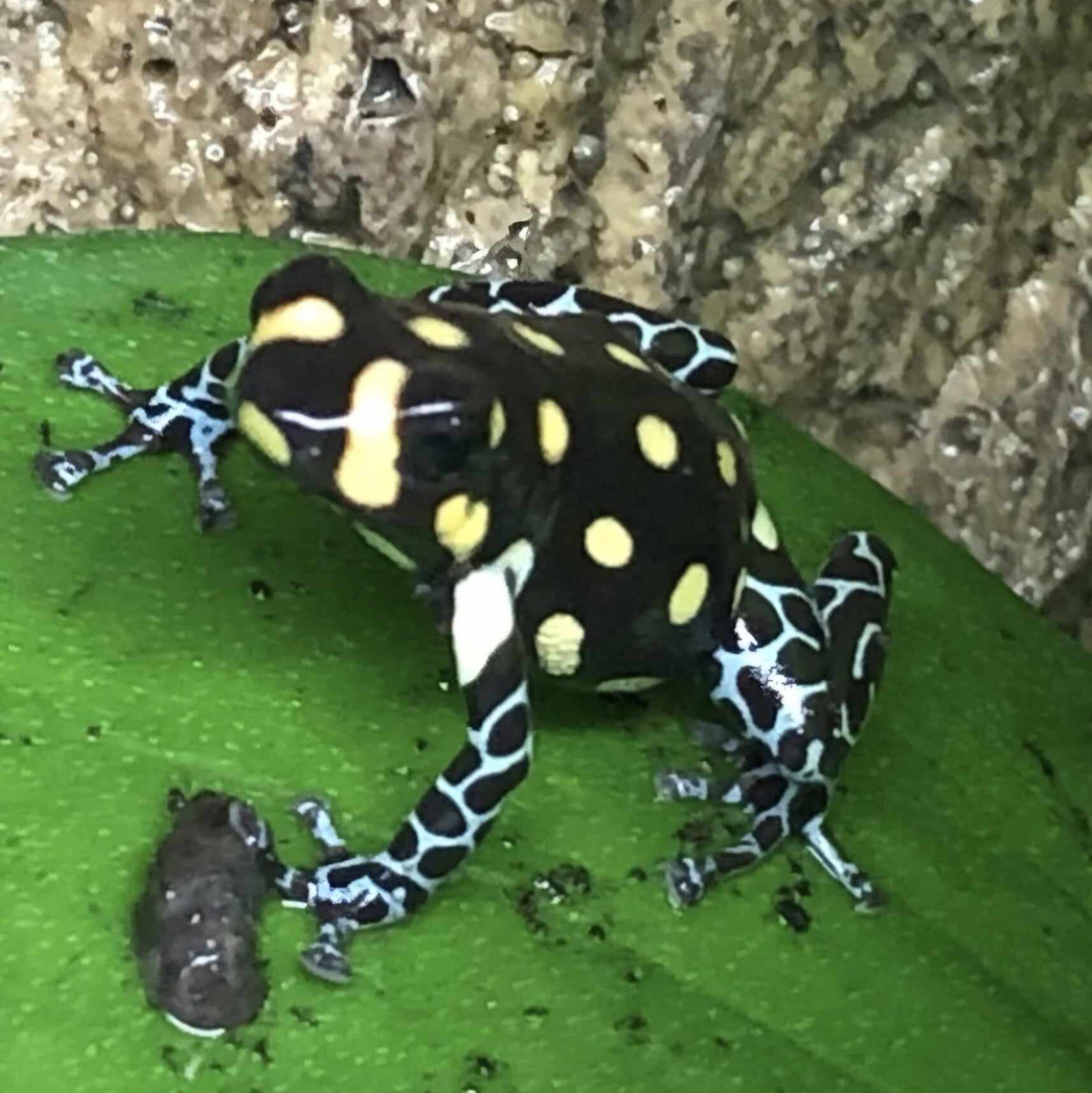 De temperatuur overdag ligt bij voorkeur tussen de 22 en 26 °C, met een daling tot ongeveer 18–20 °C ’s nachts. De luchtvochtigheid moet hoog blijven, rond de 90–100%, met dagelijkse sproeibeurten. Goede ventilatie is essentieel om schimmelvorming te voorkomen. Het terrarium moet voorzien zijn van een dichte beplanting met bromelia’s, varens, mos en klimplanten. Deze planten bieden zowel beschutting als broedplekken.