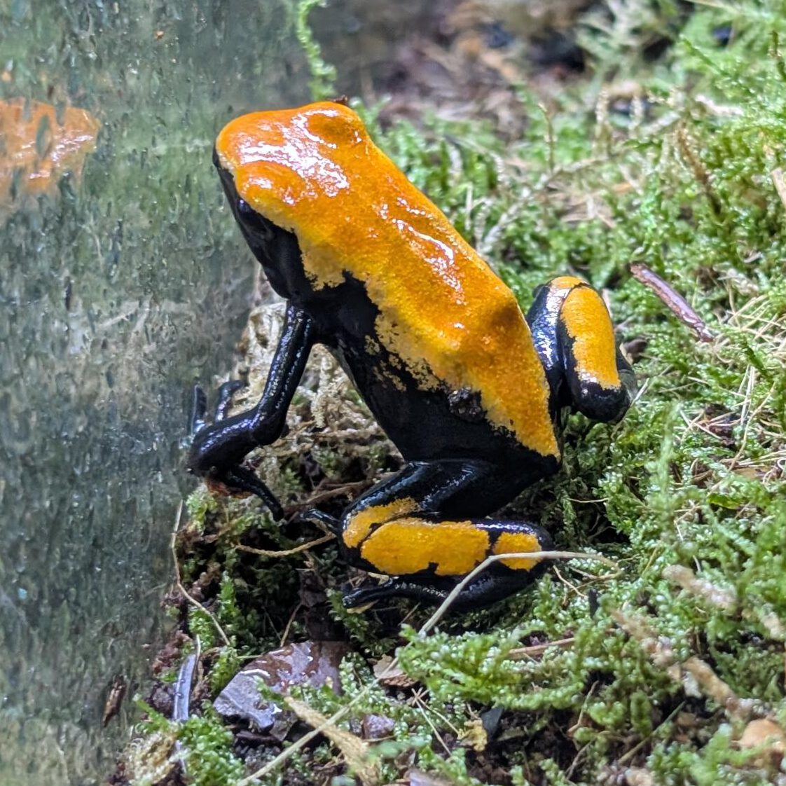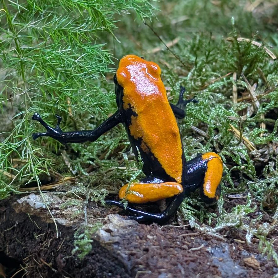 De Adelphobates galactonotus “Orange” is een opvallende pijlgifkikker met een dieporanje tot roodachtige kleur en een contrasterende zwarte rug. Deze soort wordt ongeveer 3–4 cm groot en is actief overdag, waardoor hij goed zichtbaar is in een tropisch terrarium.