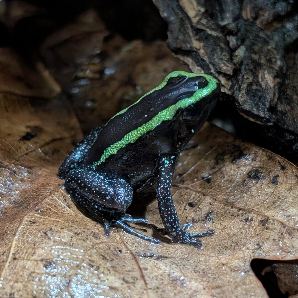 Qua voeding is de Phyllobates aurotaenia iets minder kieskeurig dan veel andere Dendrobaten. Naast fruitvliegen (kleine en grote variant) eten ze ook graag wat grotere prooidieren, zoals kleine krekels en ovenvisjes. Ook springstaarten, bladluizen en weideplankton worden met smaak gegeten. Voor een optimale gezondheid is het verstandig de voedseldieren wekelijks te bestuiven met een vitaminen- en mineralenmix.