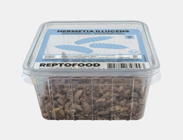 1 bakje zwarte soldaatvliegen bevat ongeveer 50g.