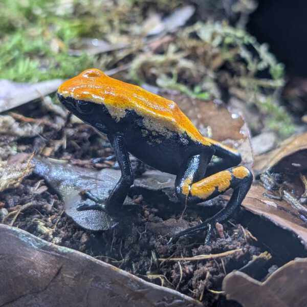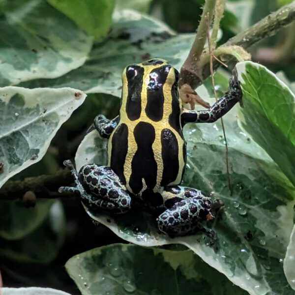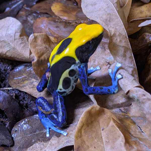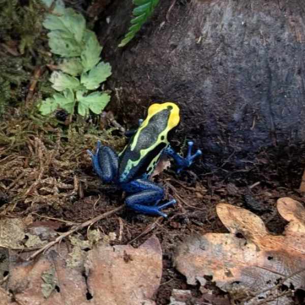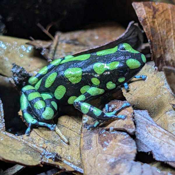 De Dendrobates auratus ‘Celeste’ is een opvallende gifkikker met een turquoise tot lichtblauwe kleurtekening op een donkere ondergrond. Deze soort is actief, goed te observeren en relatief eenvoudig te houden binnen de juiste omstandigheden.