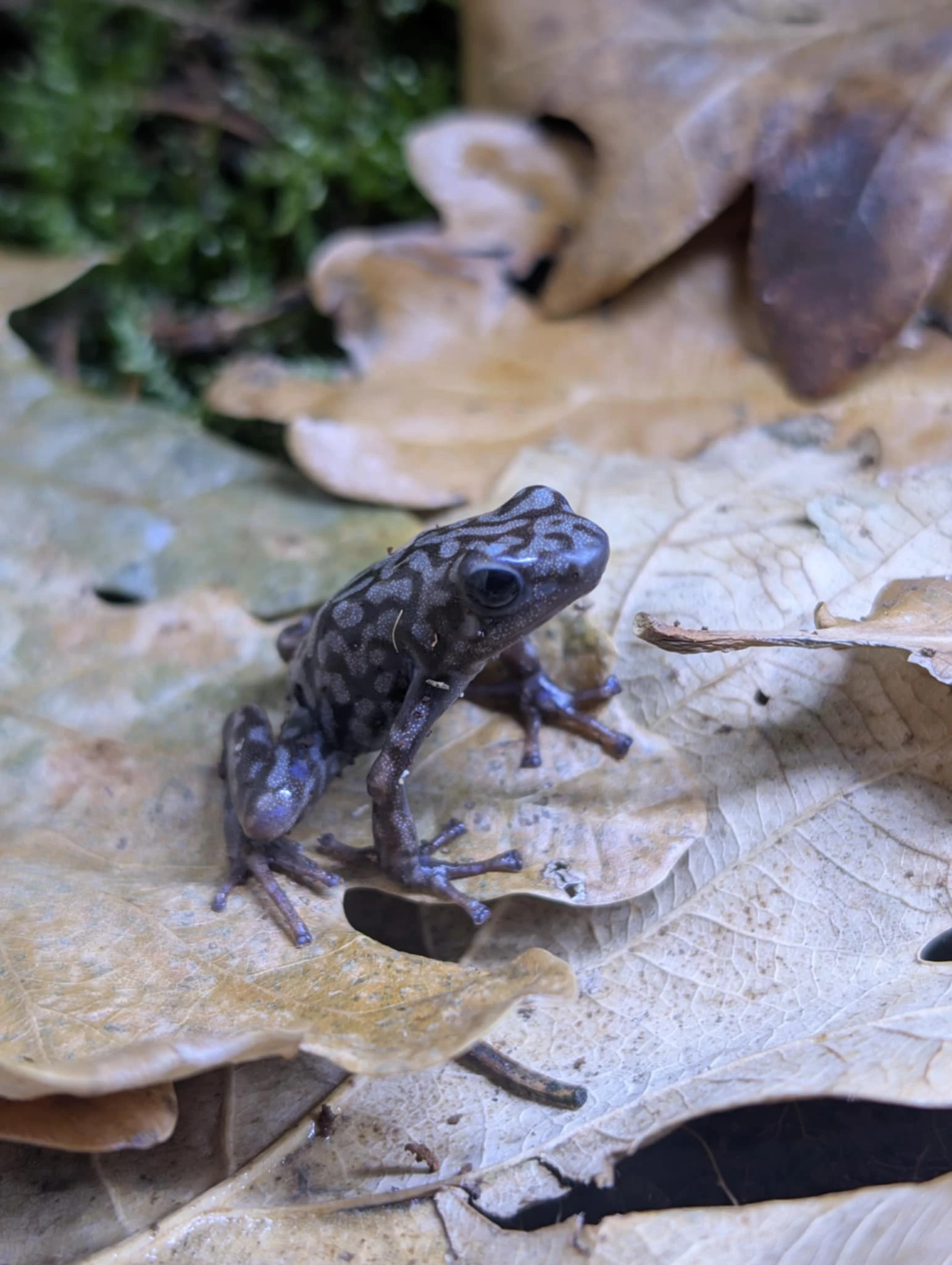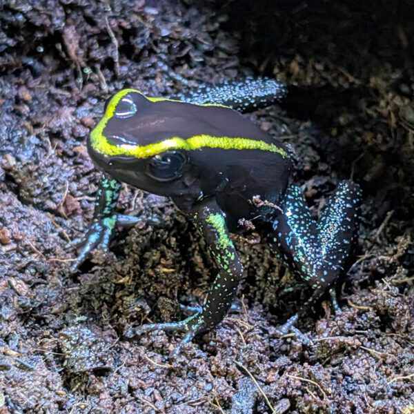 De Dendrobates auratus Peña Blanca is een prachtige en populaire soort uit Midden-Amerika. Deze kleurrijke kikker heeft een terrarium van minimaal 50 x 50 x 50 cm per koppel nodig, met voldoende klim- en schuilplekken. Het terrarium moet een luchtvochtigheid van 70-80% hebben en een temperatuur tussen 22-28°C.
