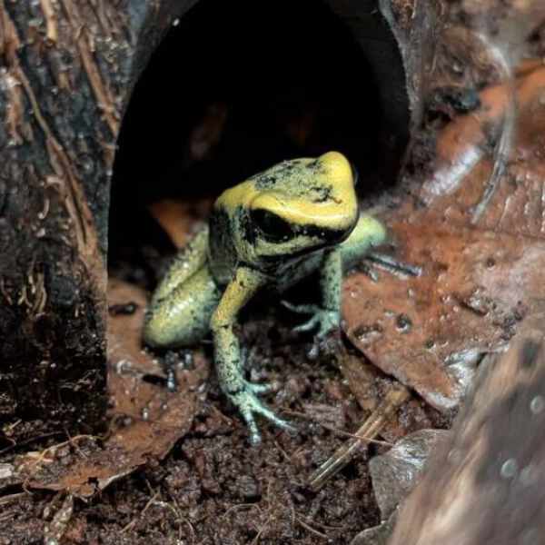 De Phyllobates Vittatus is een prachtige soort met een zwart lichaam, felgele of oranje strepen en een metallic groene glans.