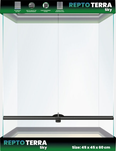 Universeel terrarium geschikt voor diverse terrariumbewoners. De openstaande voordeuren en de volledig te openen bovenkant geven een gemakkelijke toegang voor inrichting en onderhoud.