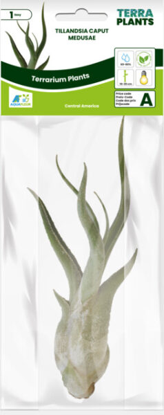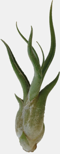Deze luchtplant heeft een verdikte basis met gedraaid groeiende bladeren. De bladeren zijn grijsgroen, fluweelachtig door de fijne haartjes die vocht opnemen.